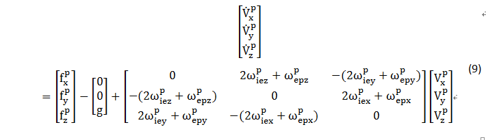速度也用帶有上下標(biāo)的符號(hào)表示,如:Vtetx ,其下標(biāo)含義為t系(地理坐標(biāo)系)相對(duì)于e系(地球坐標(biāo)系)的速度,上標(biāo)含義為此速度在t系(地理坐標(biāo)系)中的投影,x表示投影在x軸上的分量。