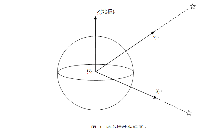地心坐標(biāo)系是慣性坐標(biāo)系(圖 1),即是絕對(duì)靜止或只做勻速直線運(yùn)動(dòng)的坐標(biāo)系。地心坐標(biāo)系的原點(diǎn)Oe選在地球中心;Zi軸選在沿地軸指向北極的方向上,而Xi、Yi軸在地球的赤道平面內(nèi),并指向空間的兩顆恒星,XiYiZi構(gòu)成右手坐標(biāo)系。三個(gè)坐標(biāo)軸指向慣性空間固定不動(dòng),此坐標(biāo)系是慣性儀表測量參考基準(zhǔn)。